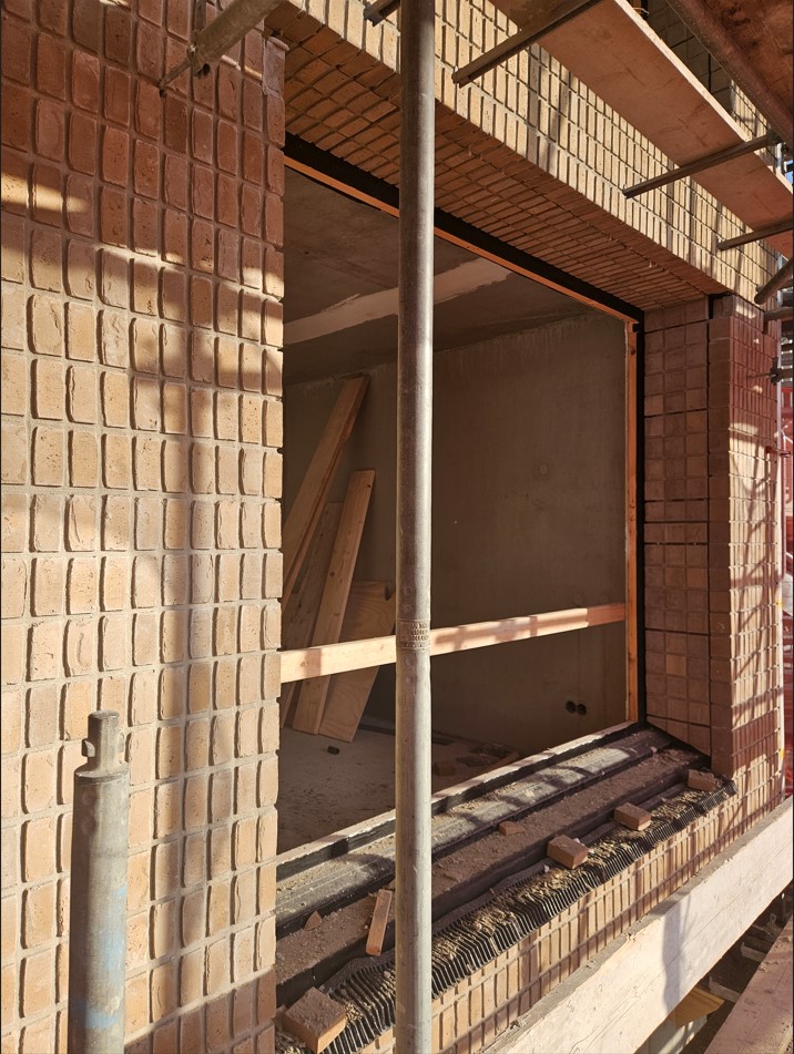 Werkvoorbereider Daan Oude Vrielink vertelt enthousiast: “Wat Metropool Zuid zo bijzonder maakt, is de technische complexiteit. We werken hier met minimale speelruimte aan een esthetisch super strak ontwerp. De gevels vereisen bijvoorbeeld precisie; we hebben geen geveldragers boven de kozijnen. Met behulp van murfor en lateihaakjes metselen we een latei dat alleen kan afdragen op de geveldragers boven de penanten. Hierdoor krijgen we het, door de architect gewenste beeld, dat het metselwerk boven de kozijnen vrijdragend is. Dat met uniek metselwerk in tegelverband maakt dat er geen ruimte is voor fouten. “Je kunt niks in het werk oplossen,” legt Daan uit. “Daarom hebben we alle beslissingen over kritische details, zoals thermische isolatie, waterhuishouding en brandveiligheid, zoveel mogelijk naar voren gehaald in het proces.”